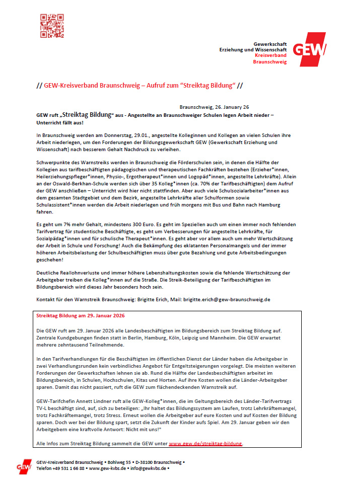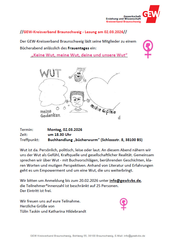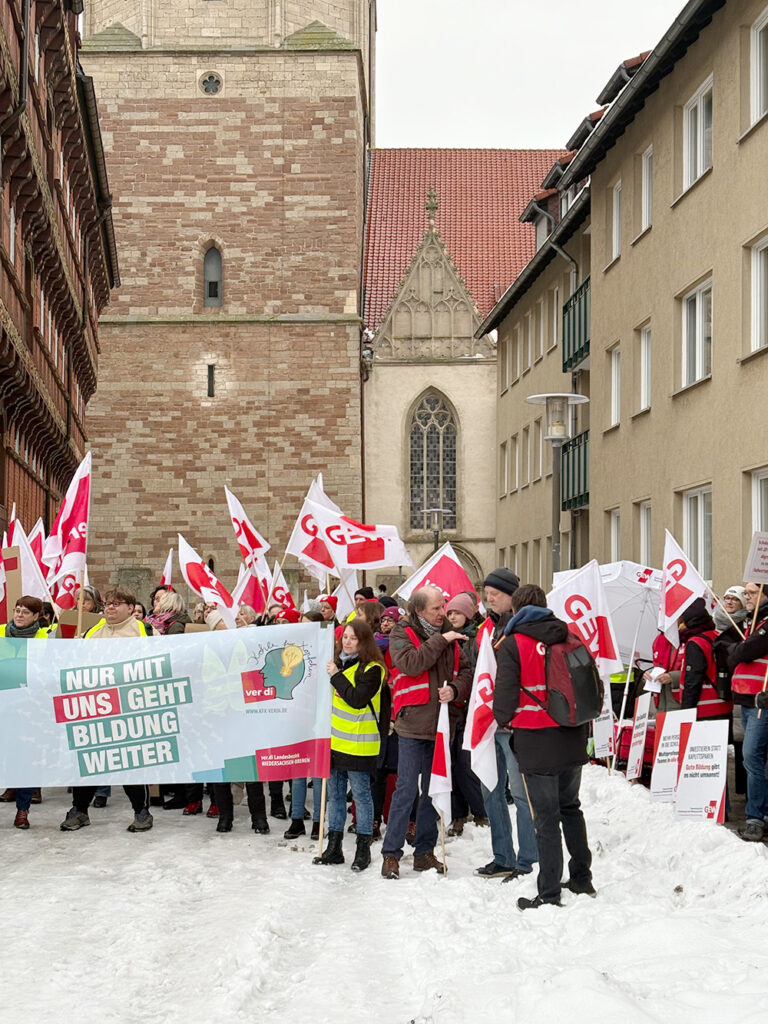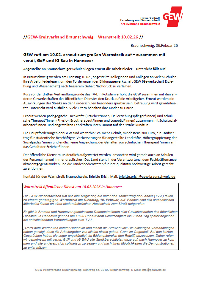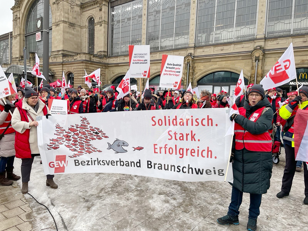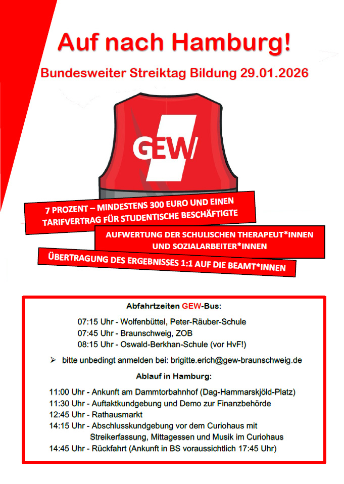 die GEW ruft alle ihre Mitglieder, die unter den Tarifvertrag der Länder fallen, und deren Betrieb in der Stadt Braunschweig liegt, zu einem ganztägigen Warnstreik am kommenden Dienstag, 13. Januar, auf. Ebenso sind alle studentischen Mitarbeiter*innen an einer der Hochschulen in der Stadt, die Mitglied in der GEW sind, zum Streik aufgerufen.