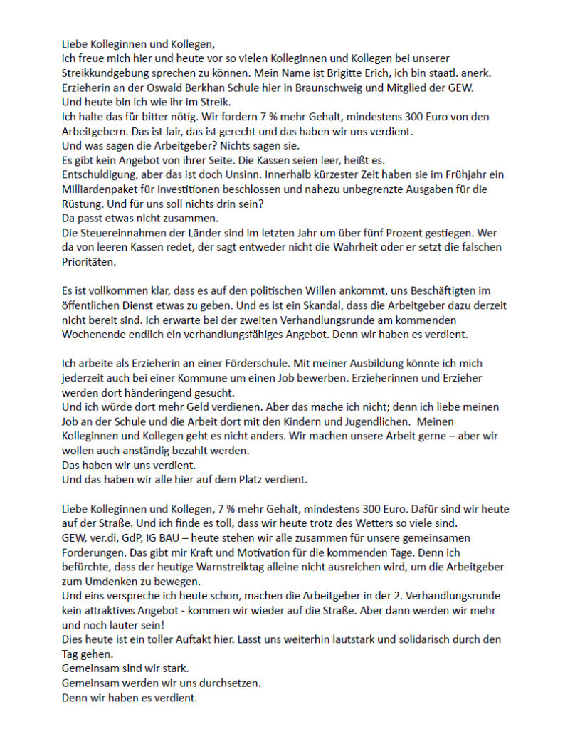 Daher rufen wir unsere betroffenen Mitglieder in der Stadt Braunschweig für den kommenden Dienstag zum Warnstreik auf.