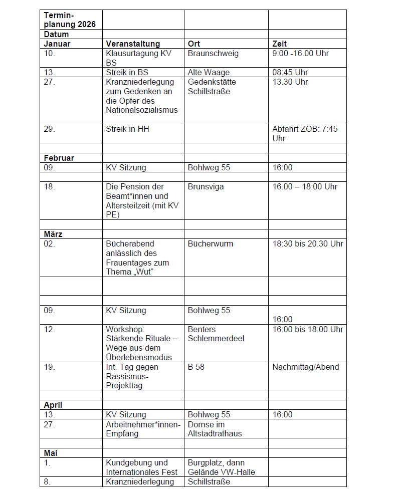 Gemeinsam mit ver.di werden wir diesen Tag gestalten. Zentraler Versammlungsort ist der Platz vor dem Staatstheater in Braunschweig, dort beginnt die Auftaktkundgebung um 9.30 Uhr. Nach dieser Kundgebung und einer kurzen und den Witterungsbedingungen angepassten Demonstration durch die Innenstadt werden wir am Gewerkschaftshaus in der Wilhelmstraße enden, wo es das Angebot einer warmen Suppe und Zeit für einen gemeinsamen Austausch geben wird.